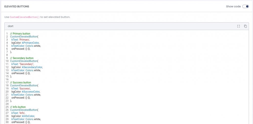To simplify learning and adoption, the FlutKit Dashboard UI Kits Demo includes an interactive UI Widgets Showcase. Every component page includes a Show code toggle that reveals the exact Flutter implementation used to render the component.