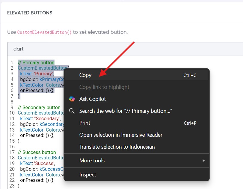 Select the component you need and copy the snippet directly. Then paste it into your Flutter widget tree.
